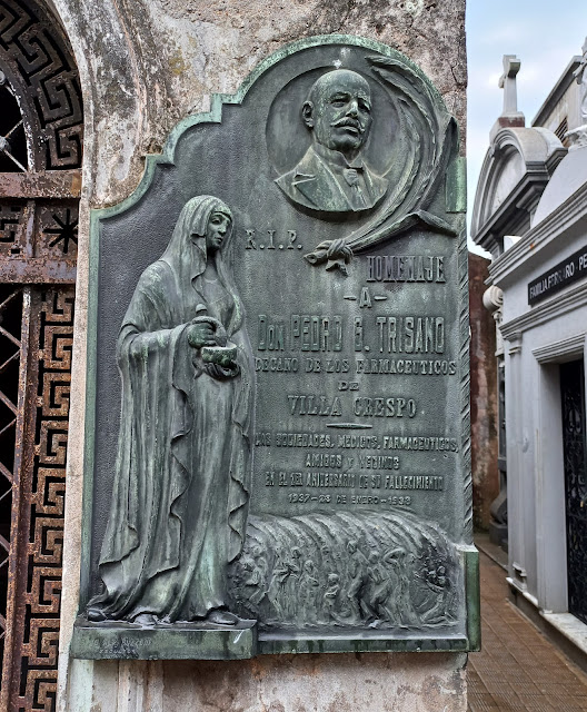 Esta placa conmemorativa de muy buena realización y compleja interpretación nos muestra el rostro del homenajeado en un medallón rodeado de PALMAS DE GLORIA. En la parte izquierda de la placa vemos una ALEGORIA DE LA CIENCIA FARMACEUTICA ya que lleva como atributo la COPA DE HIGIA, símbolo de la ciencia farmacéutica con la serpiente de la sabiduría y la sanación. En el ángulo derecho y a los pies de esta alegoría vemos una procesión que aparentemente también celebra a esta figura con palmas. En ella podemos leer la siguiente inscripción. "R.I.P. Homenaje a Don PEDRO G. TRISANI. Decano de los farmacéuticos de Villa Crespo. Las sociedades, médicos, farmacéuticos, amigos y vecinos en el 1er. aniversario de su fallecimiento. 1937-23 de enero-1938" En el ángulo inferior vemos la firma del escultor G.A.R. BUZZONI de quien hasta el momento no tengo mayor información. Esta placa esta ubicada en el frente del monumento funerario cuyo titular es JUAN BAUTISTA REUSSI.
